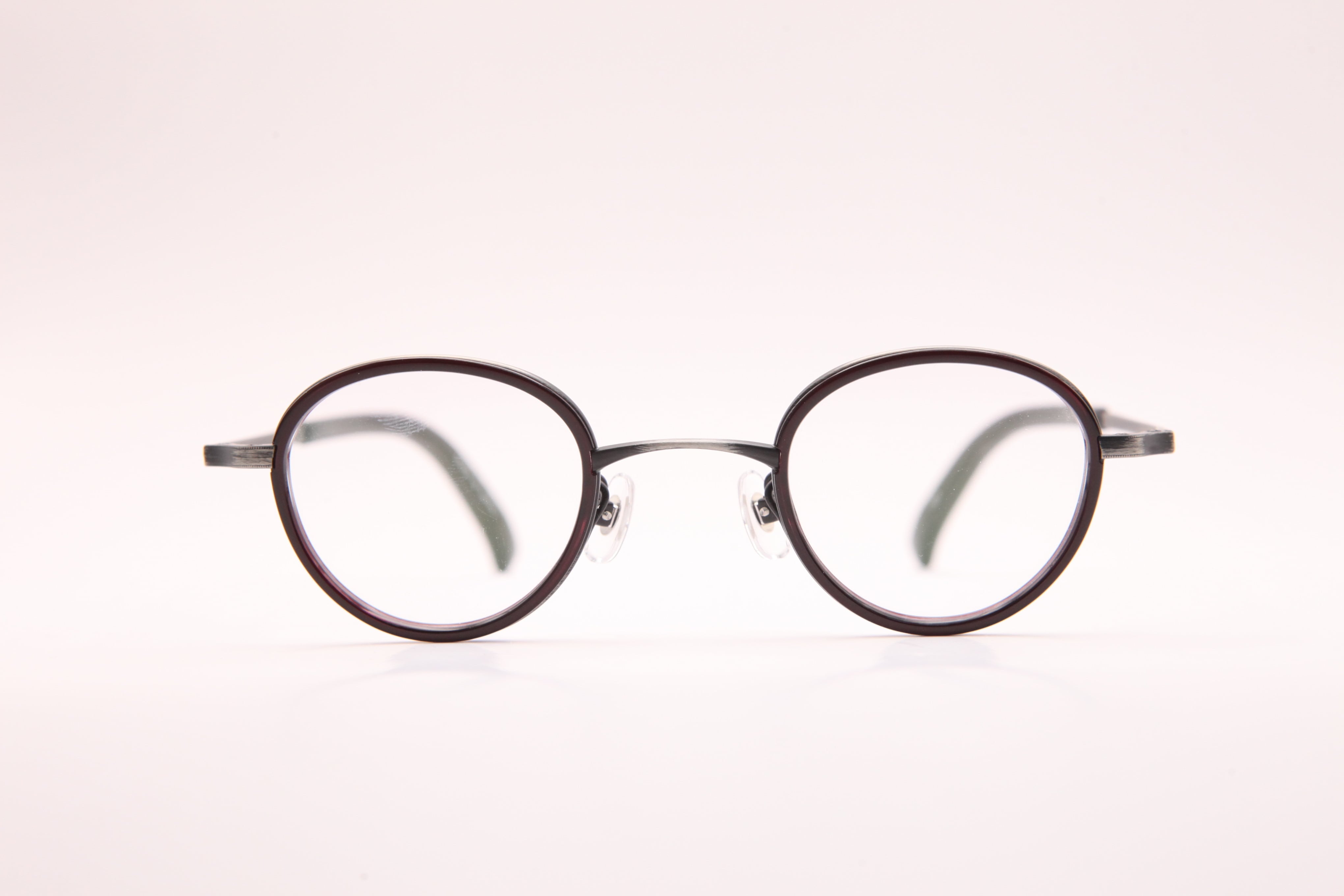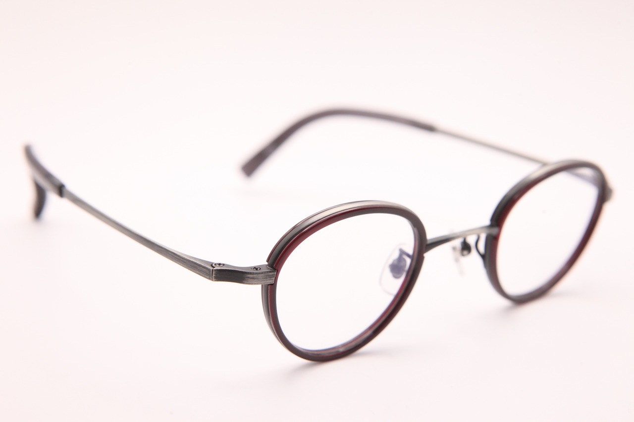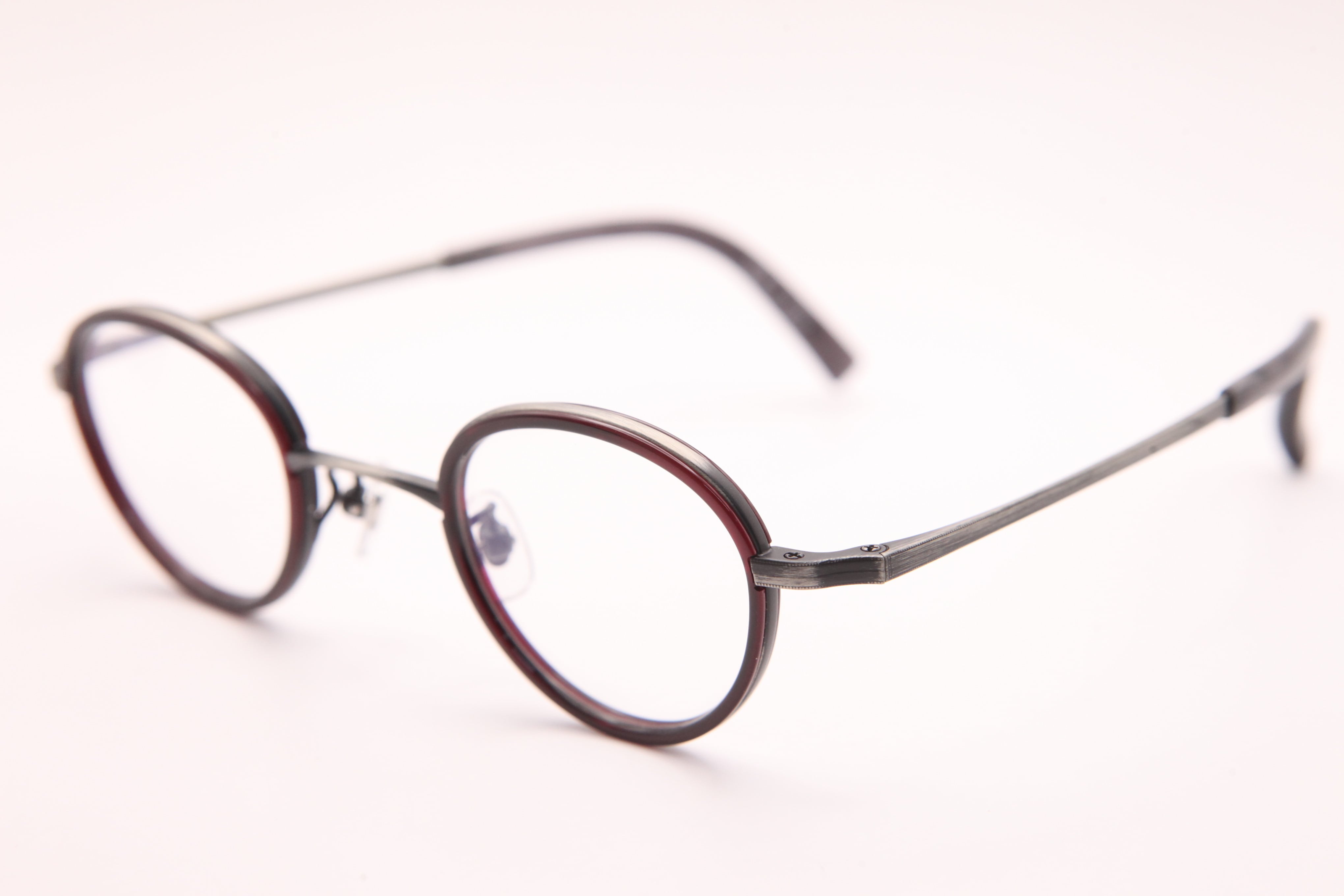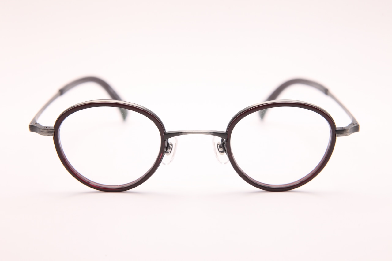 アンティークシルバーのメタルと、えんじ色のセル巻きがポイントの小ぶりのフレーム。