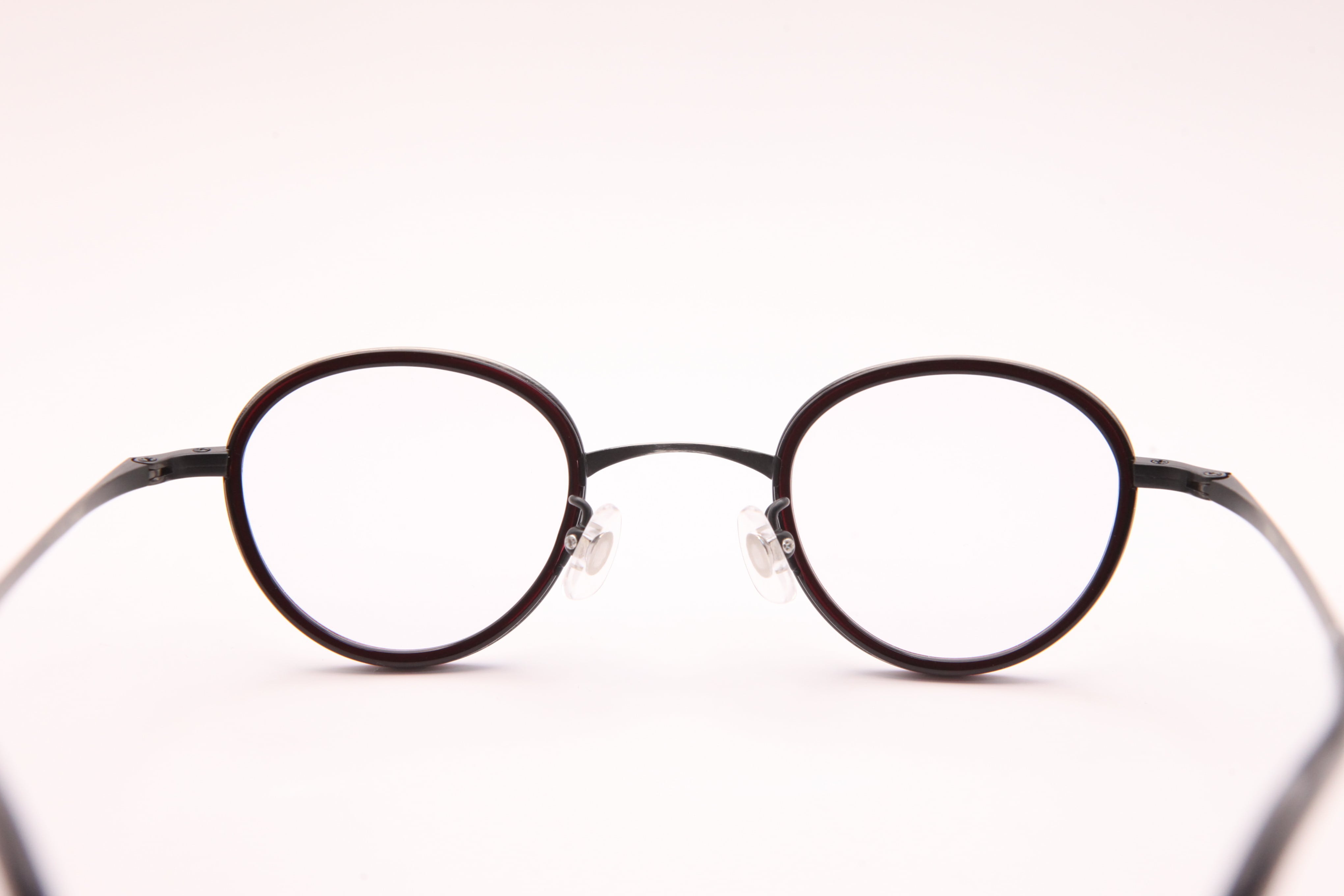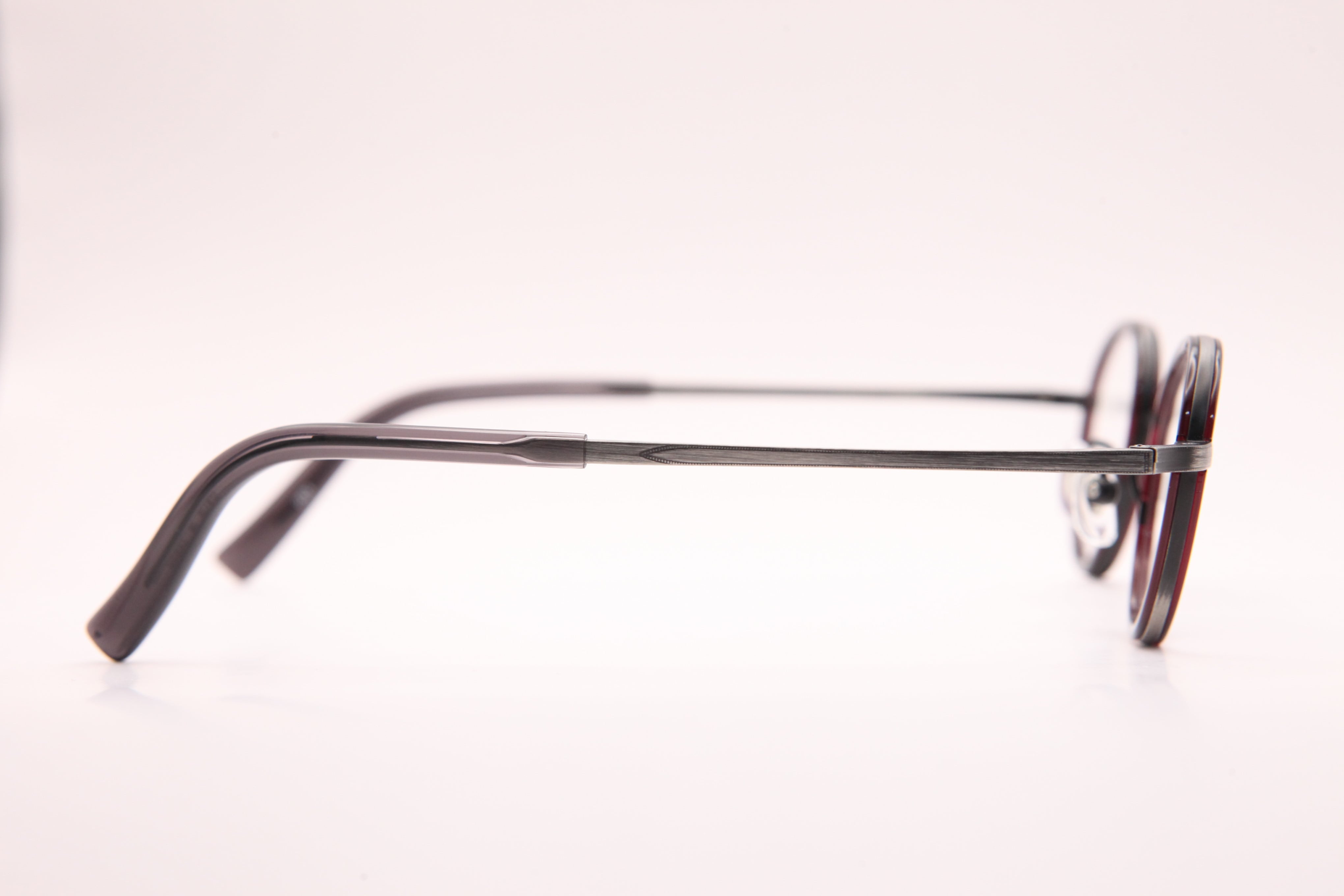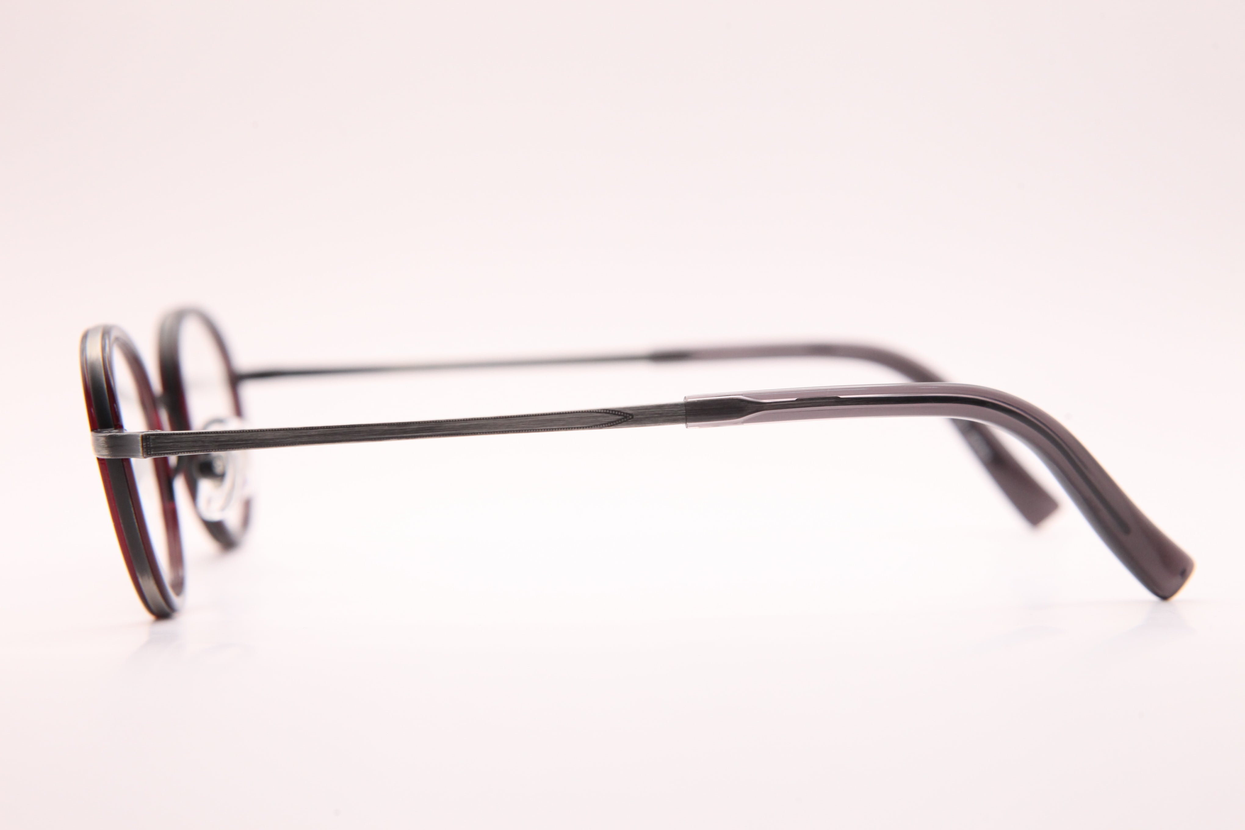 アンティークシルバーのメタルと、えんじ色のセル巻きがポイントの小ぶりのフレーム。