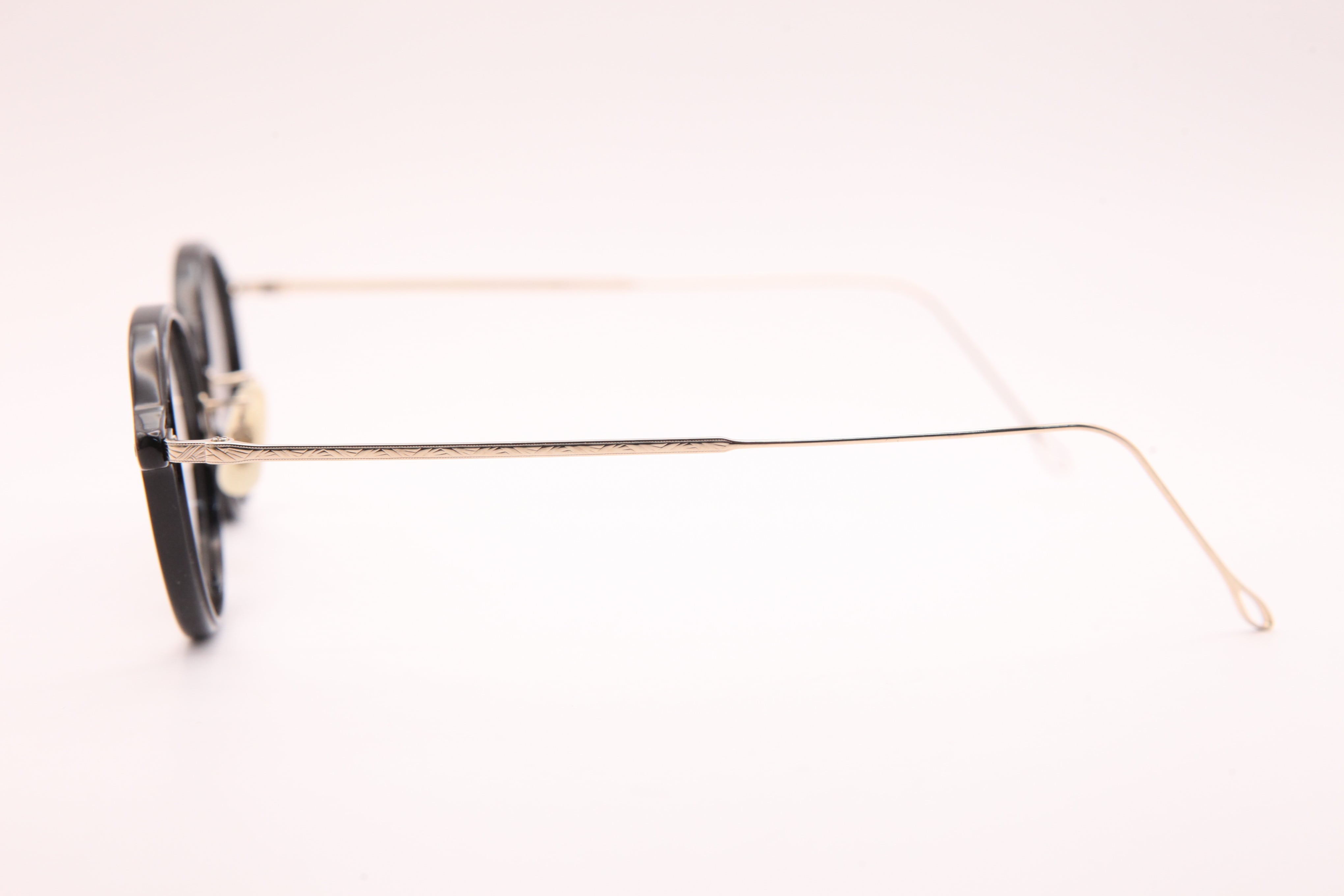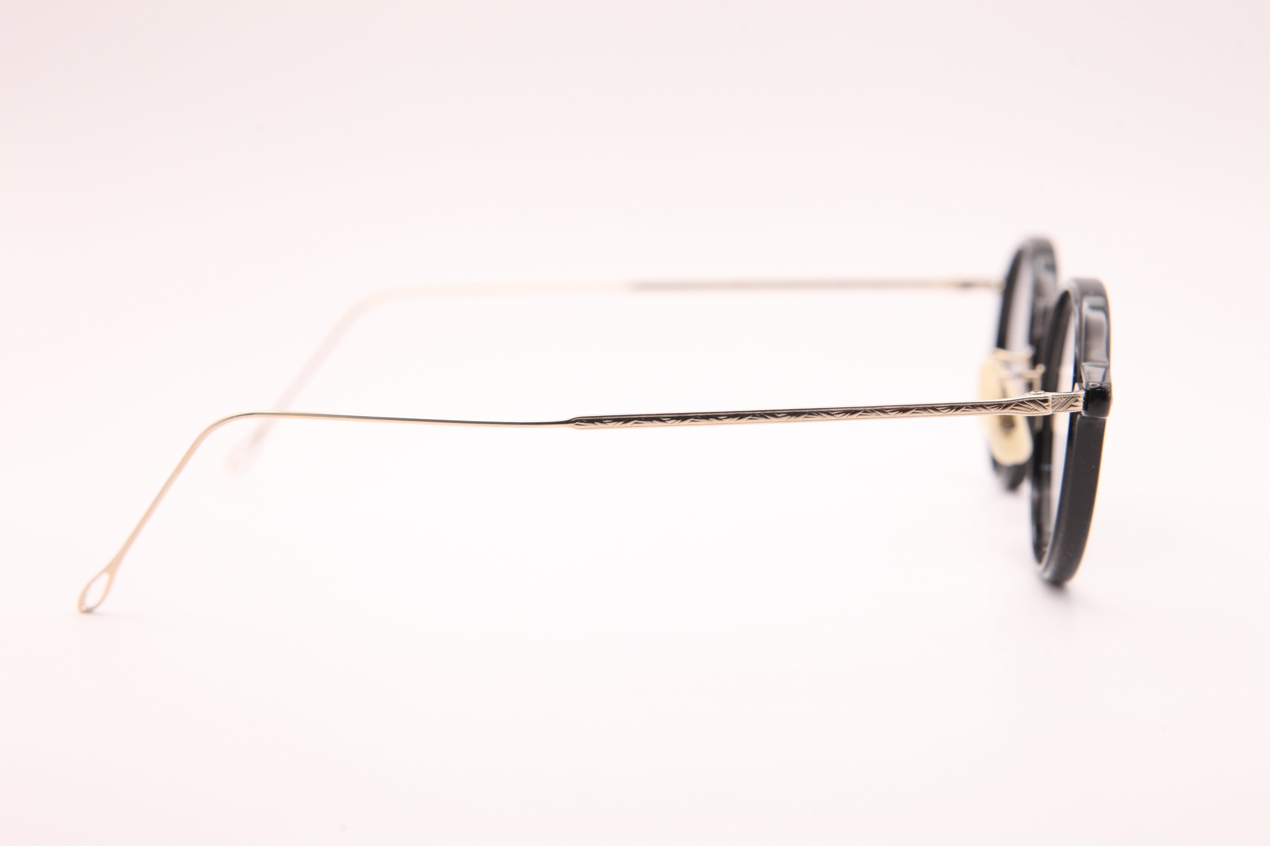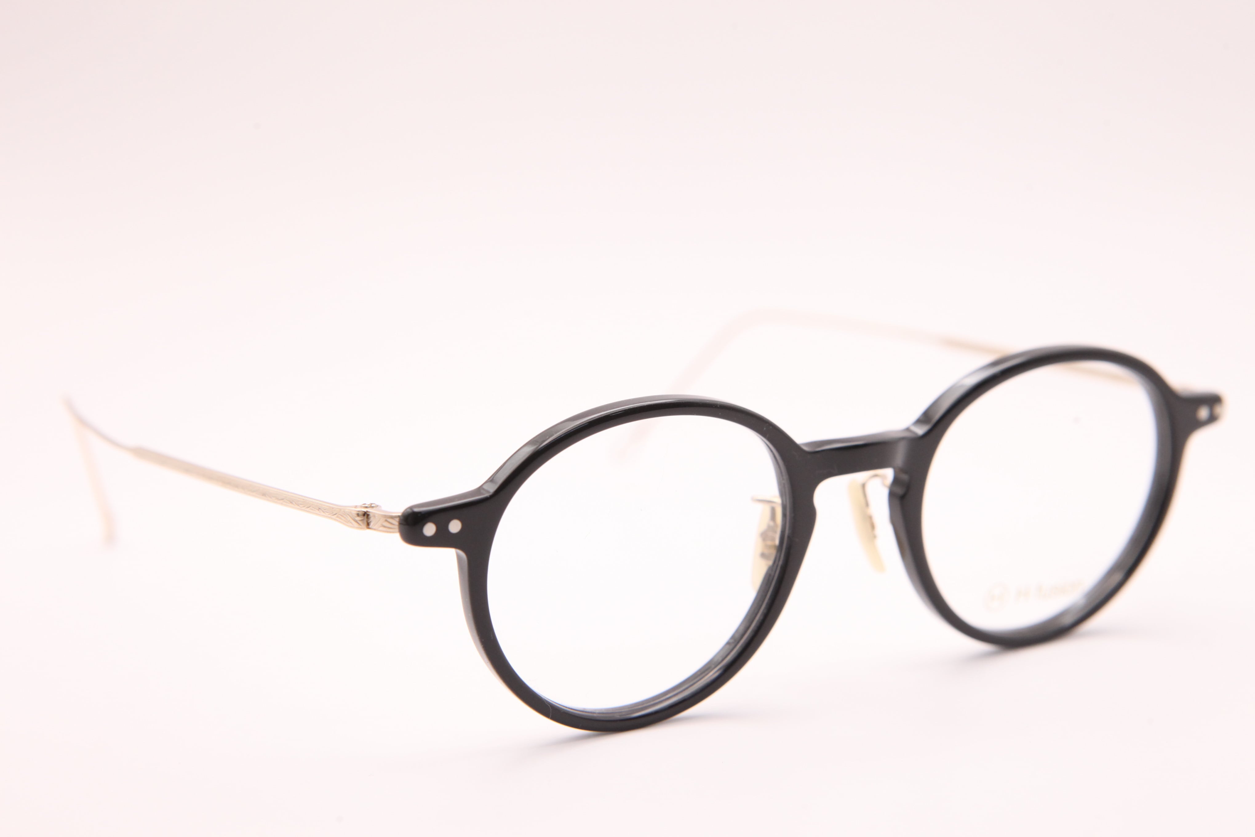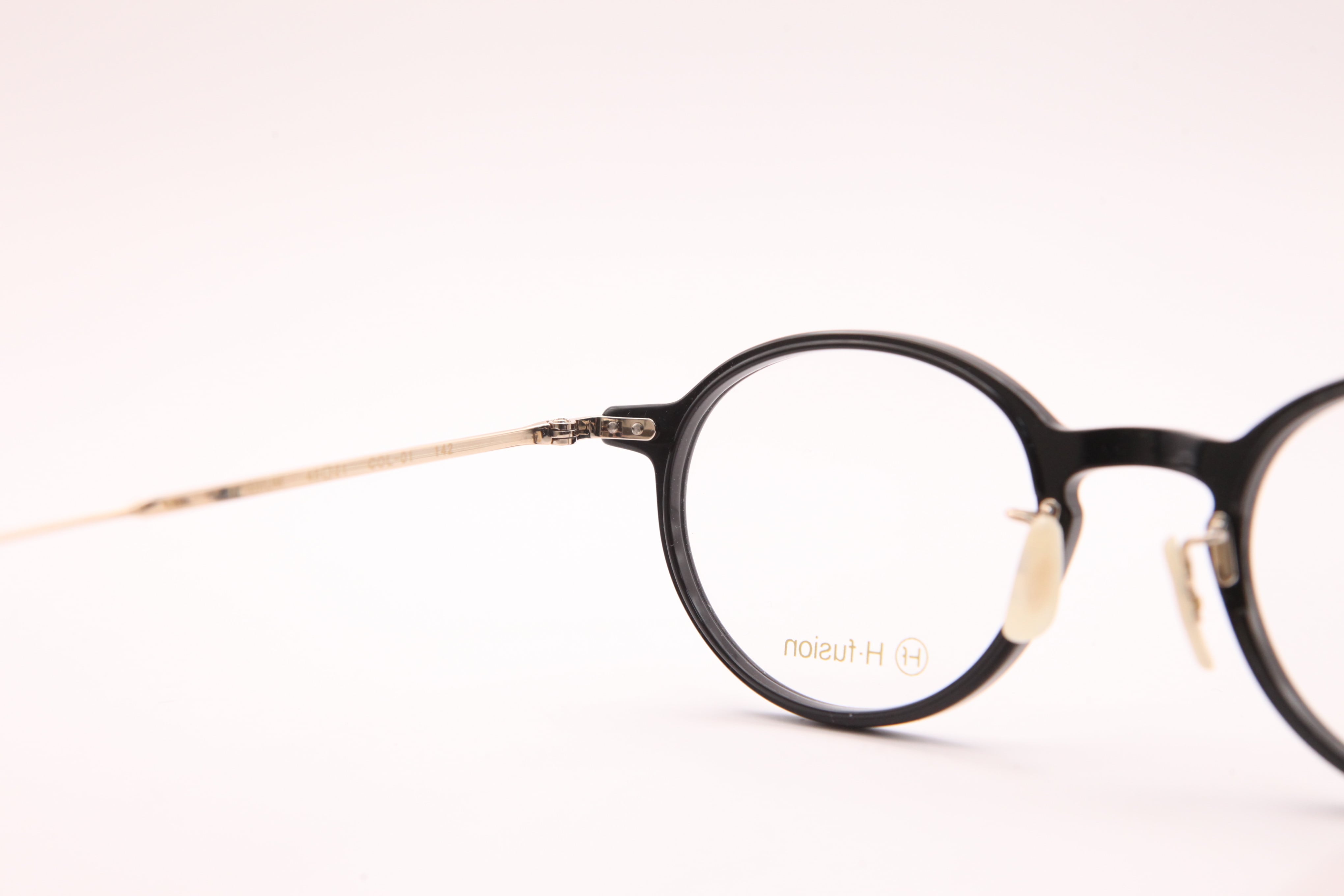 HF-142はフロントはアセテートを使用し、テンプルは繊細な彫金の入ったチタンを仕様したコンビネーションフレーム。クラシックになりすぎないデザインで女性が綺麗に掛けられるシリーズです。鼻パッドは弾性のある素材を使用しているため、優しい肌あたりで安定した装着性があります。