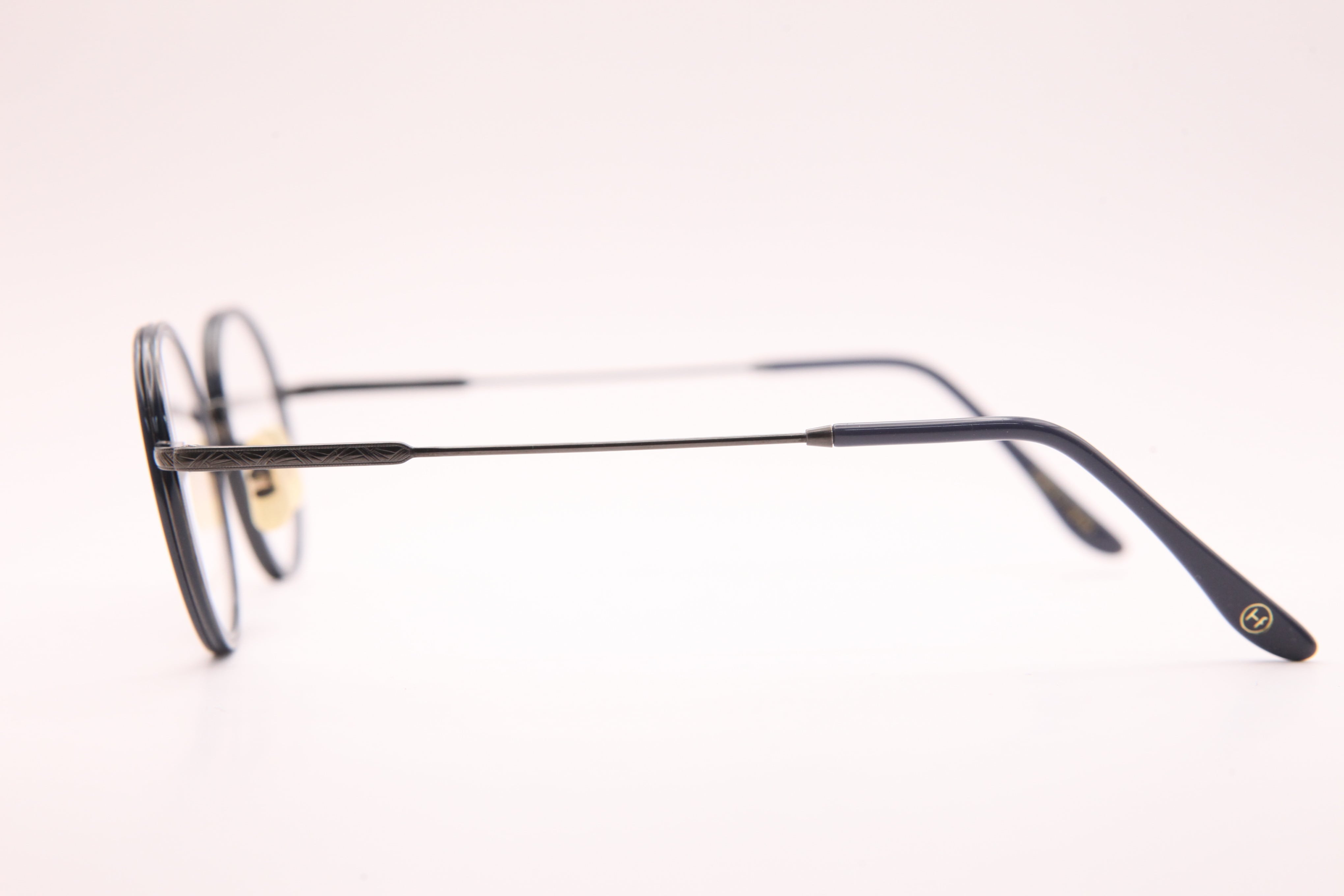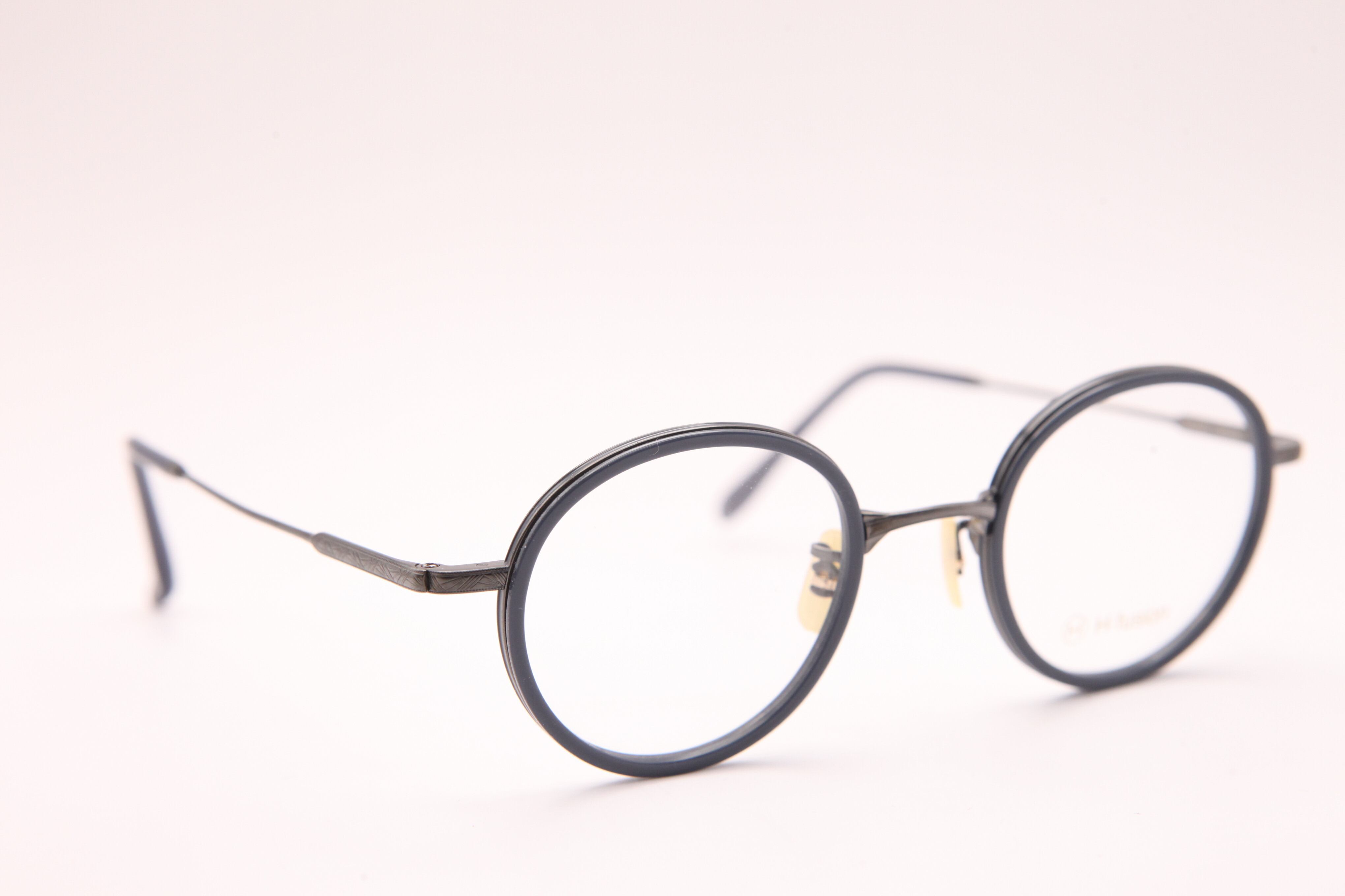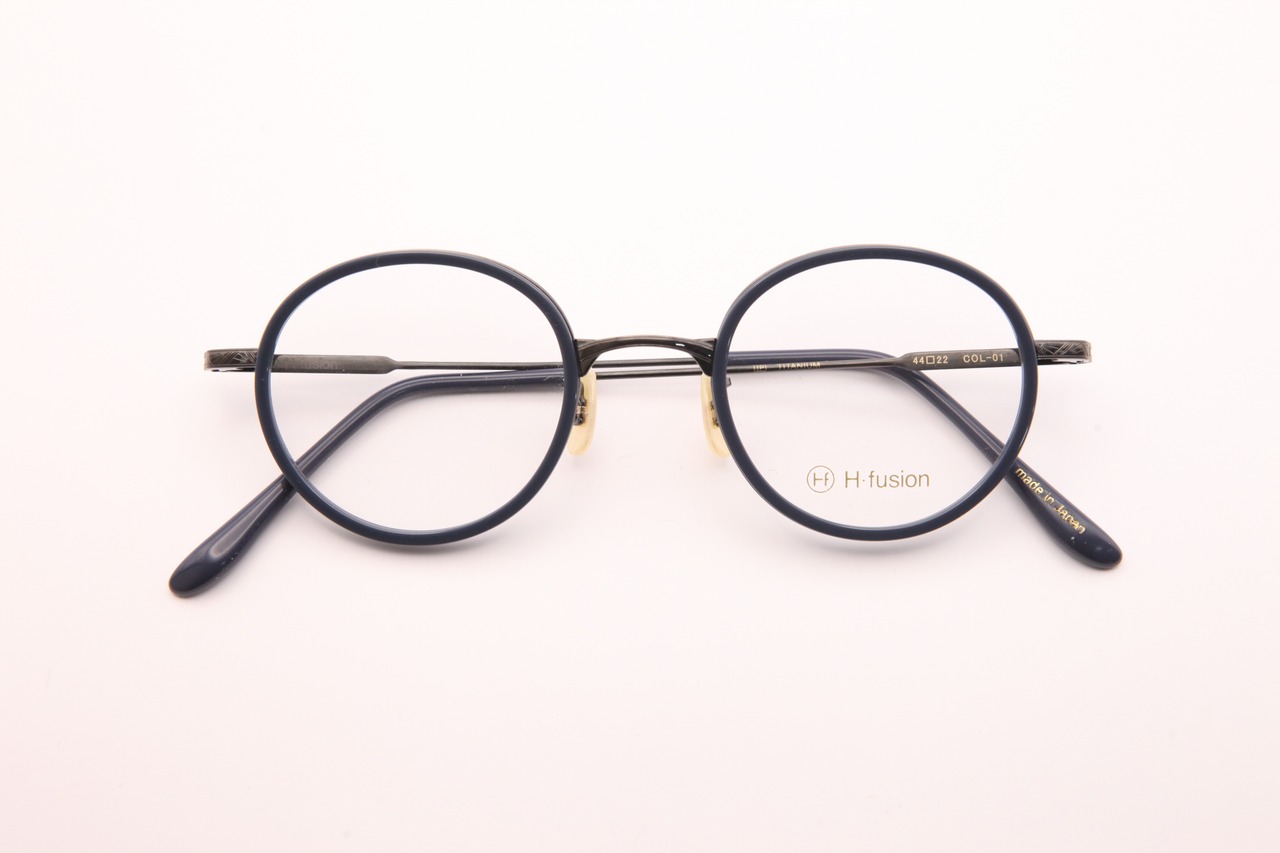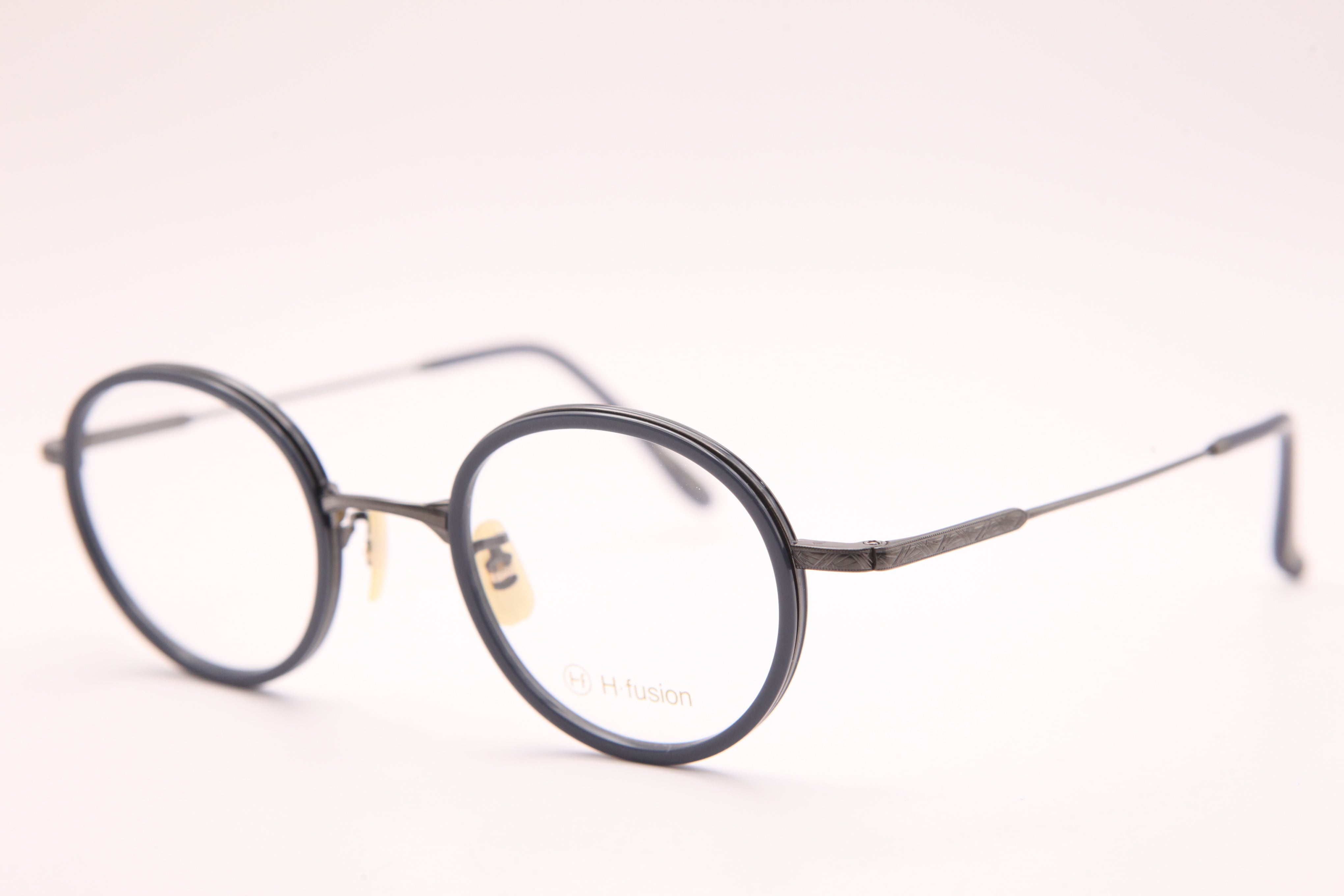 HF-148はフロントはアセテートを使用し、テンプルは繊細な彫金の入ったチタンを仕様したコンビネーションフレーム。小ぶりでラウンド寄りのボストンシェイプ。
