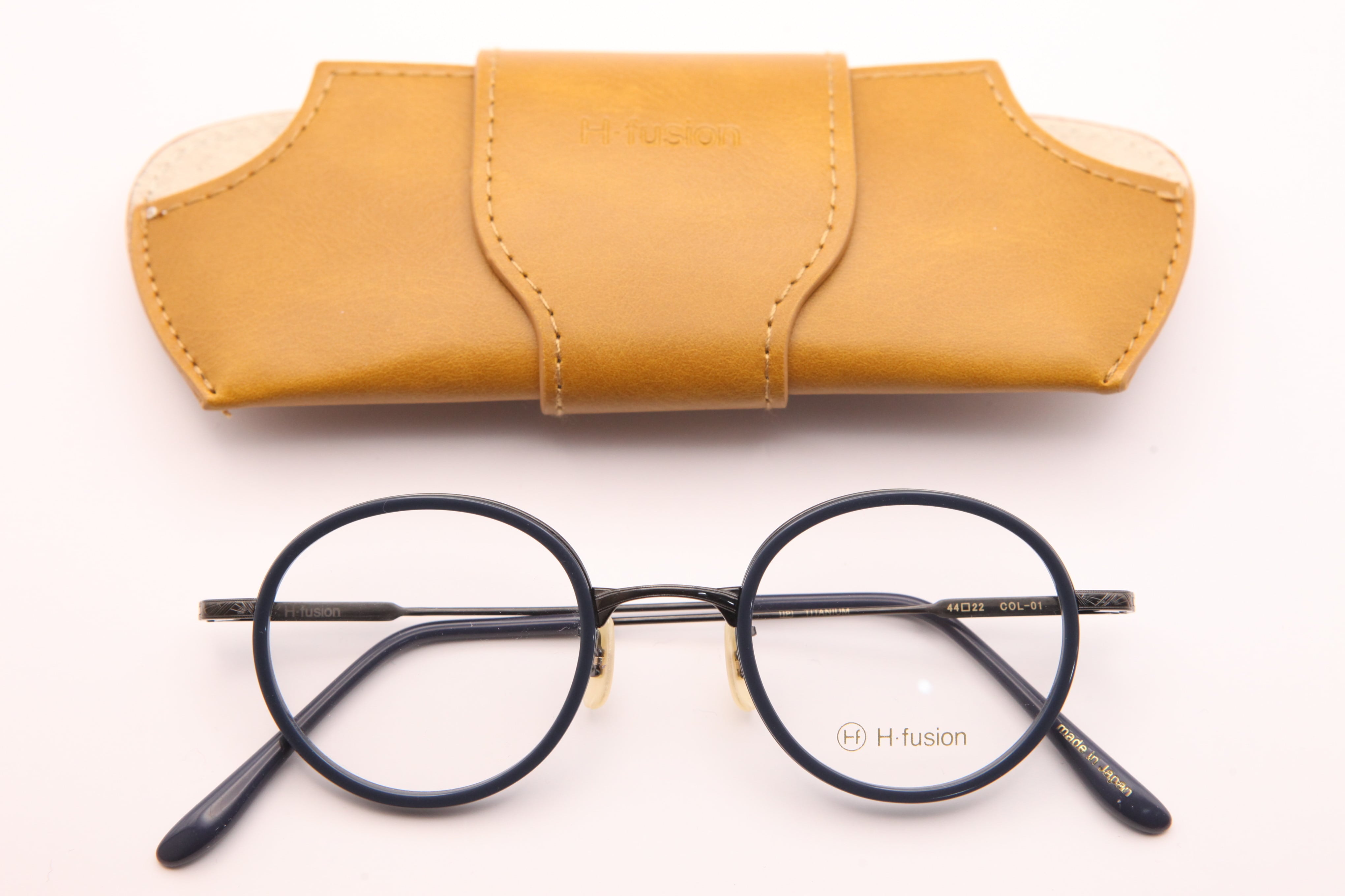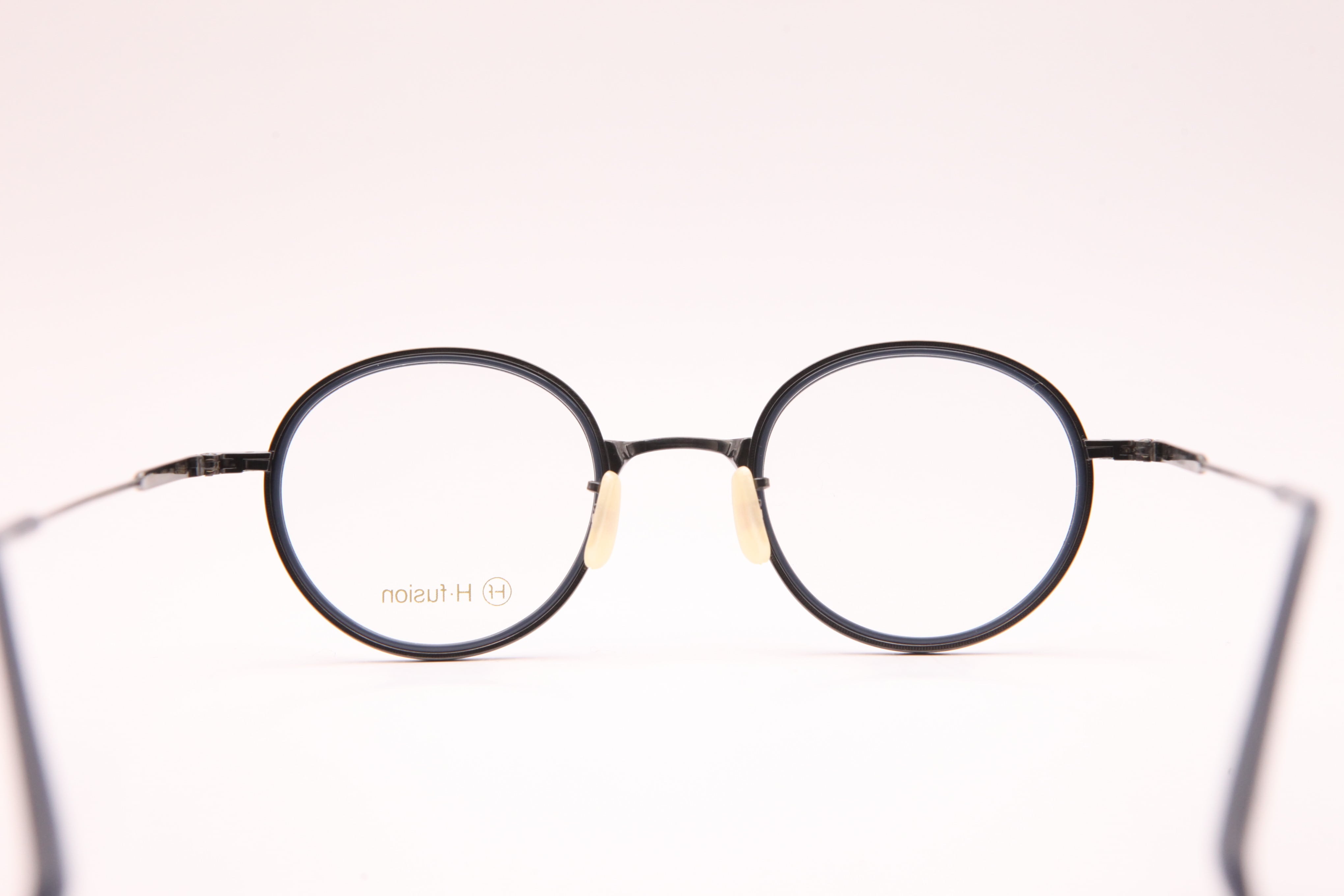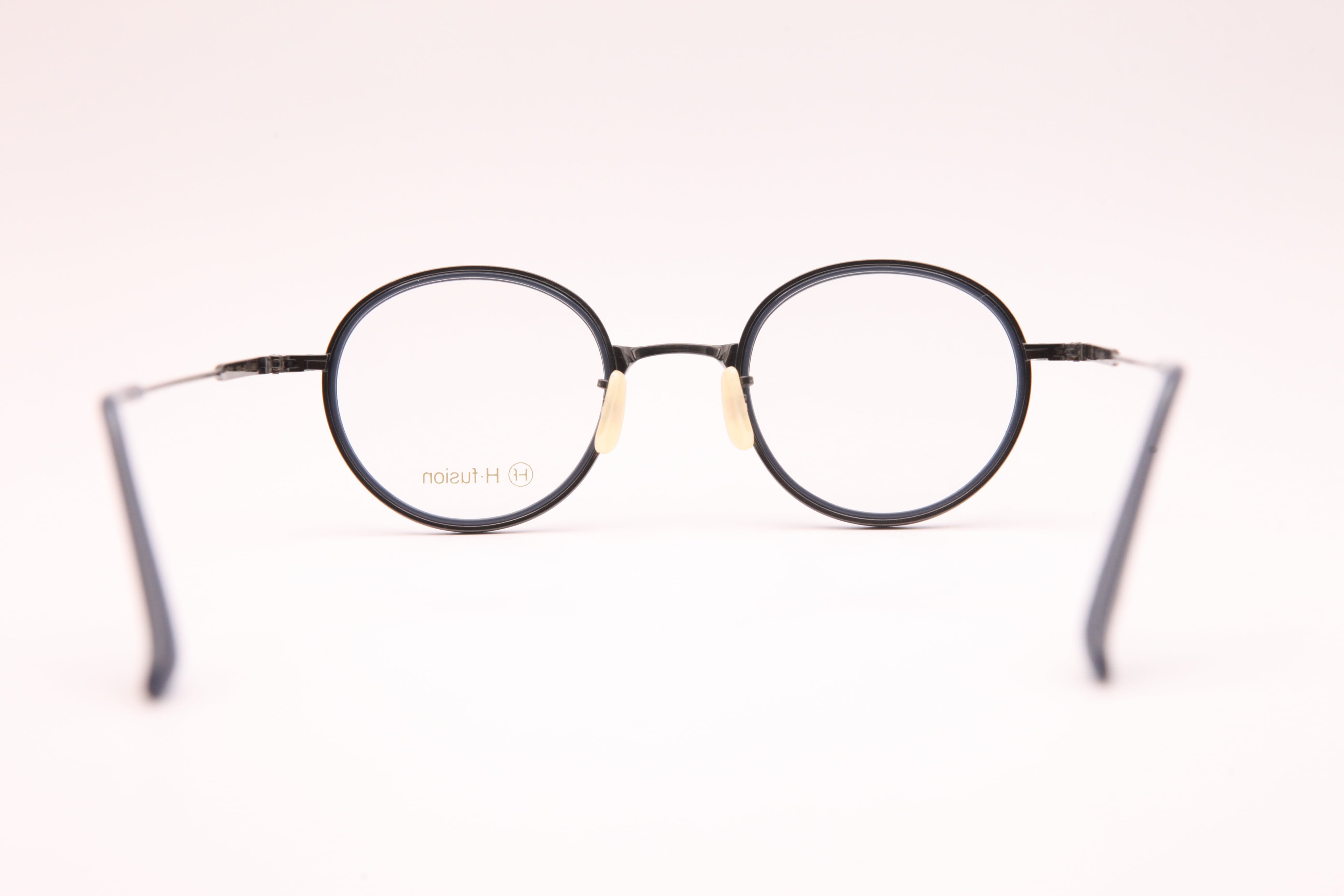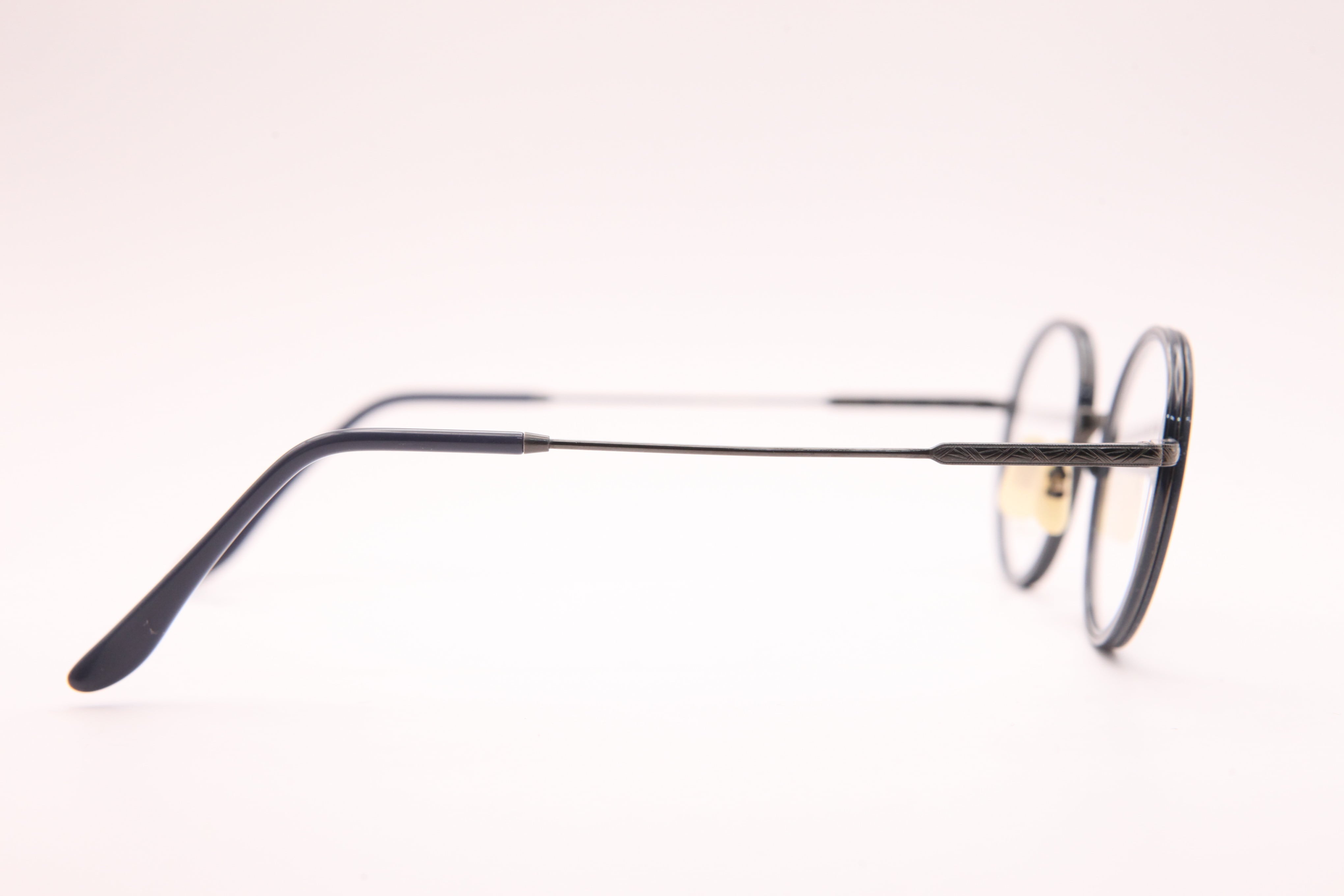 HF-148はフロントはアセテートを使用し、テンプルは繊細な彫金の入ったチタンを仕様したコンビネーションフレーム。小ぶりでラウンド寄りのボストンシェイプ。