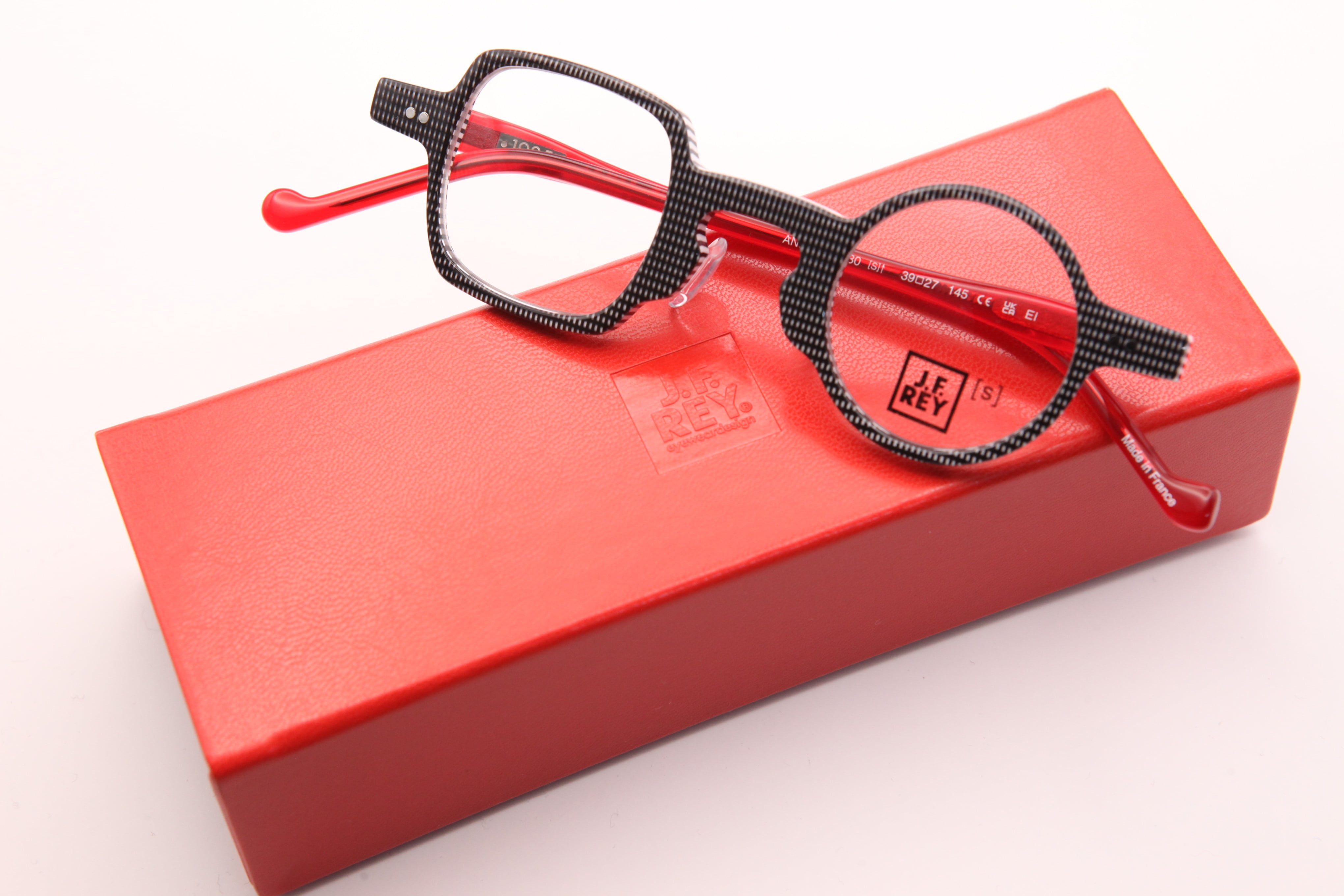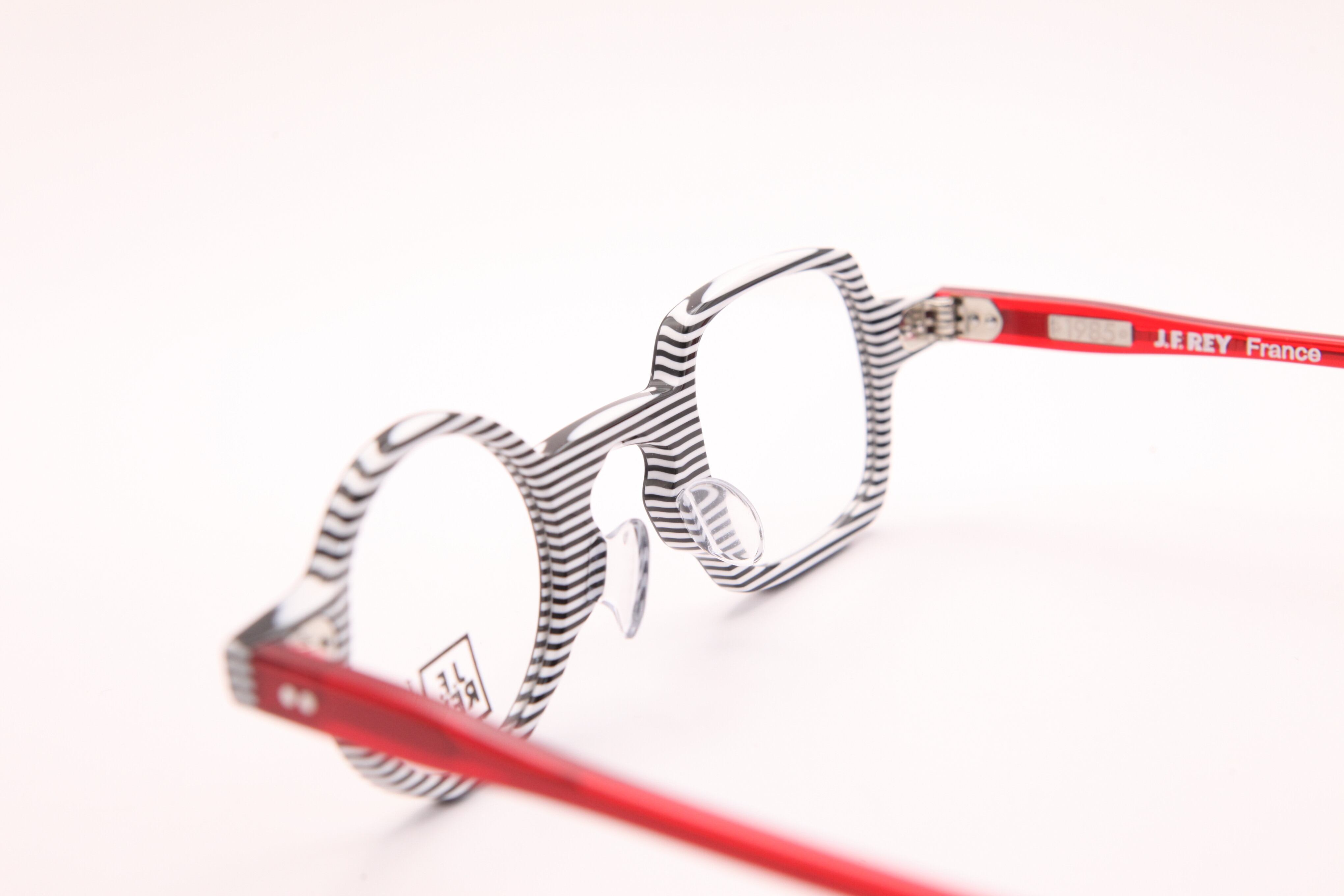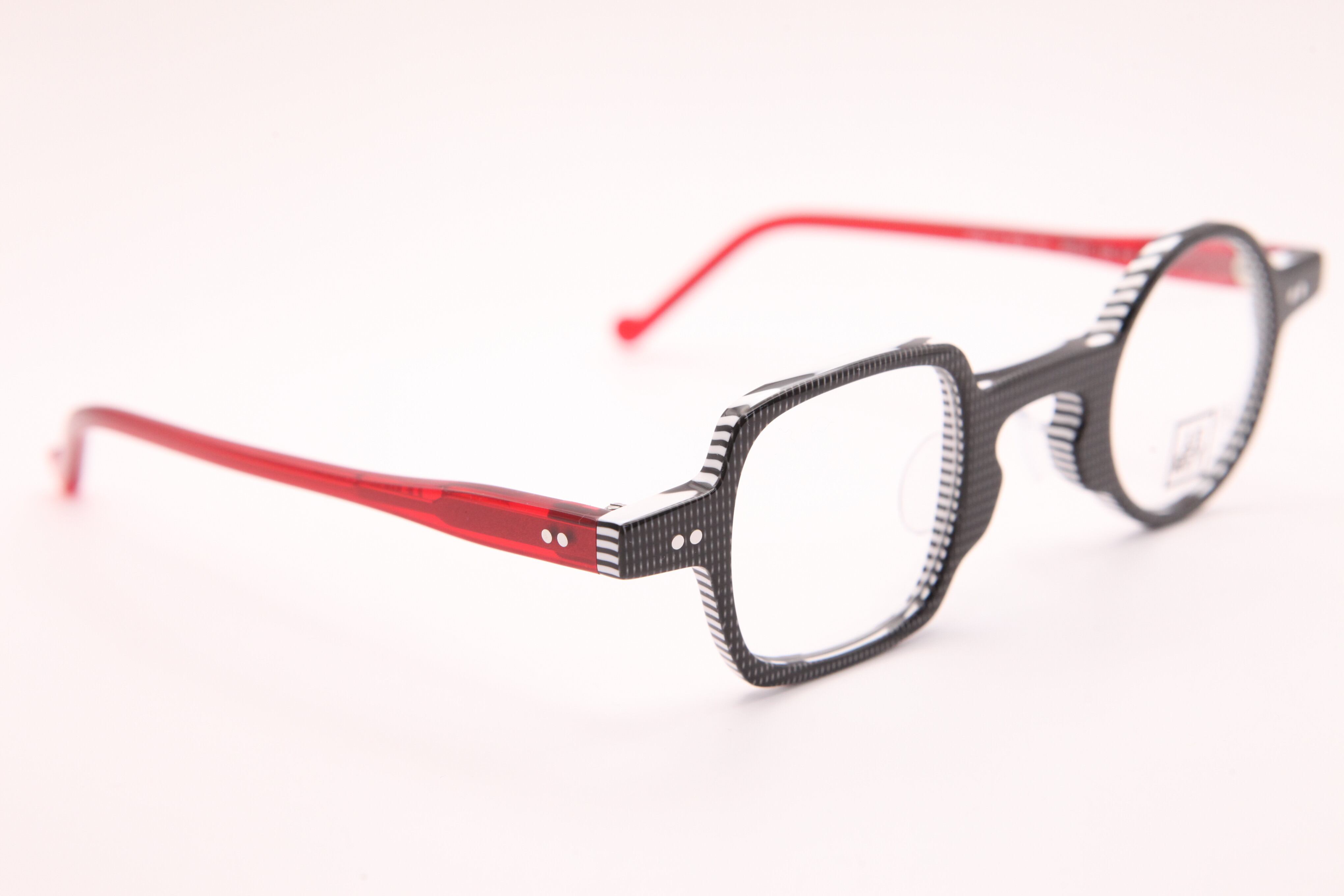 モノトーンカラーの珍しい柄生地を使ったフロントと、赤いテンプルの組み合わせが目を惹きます。人と違う眼鏡が良い、ちょっと攻めた眼鏡が欲しいという方におすすめです。
