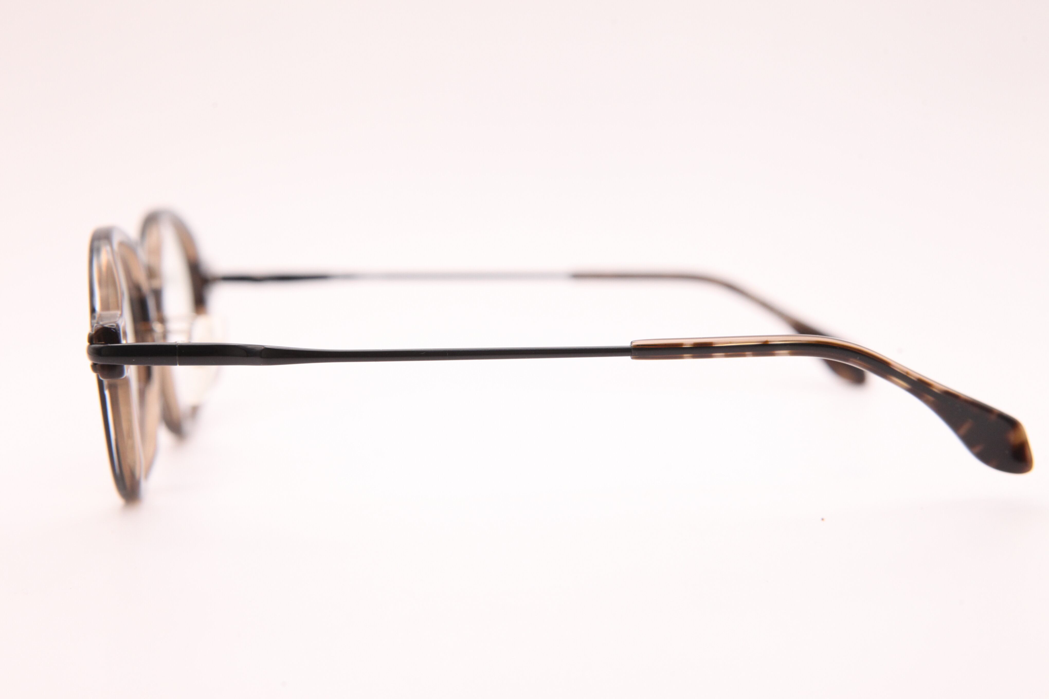 濃いめのハバナ柄とクリアブラウンの張り合わせ生地を使用したフロントに、チタン素材で作られた極細テンプルの曲線が美しいコンビネーションフレーム。デイリーに使いやすく、控えめに個性を主張します。