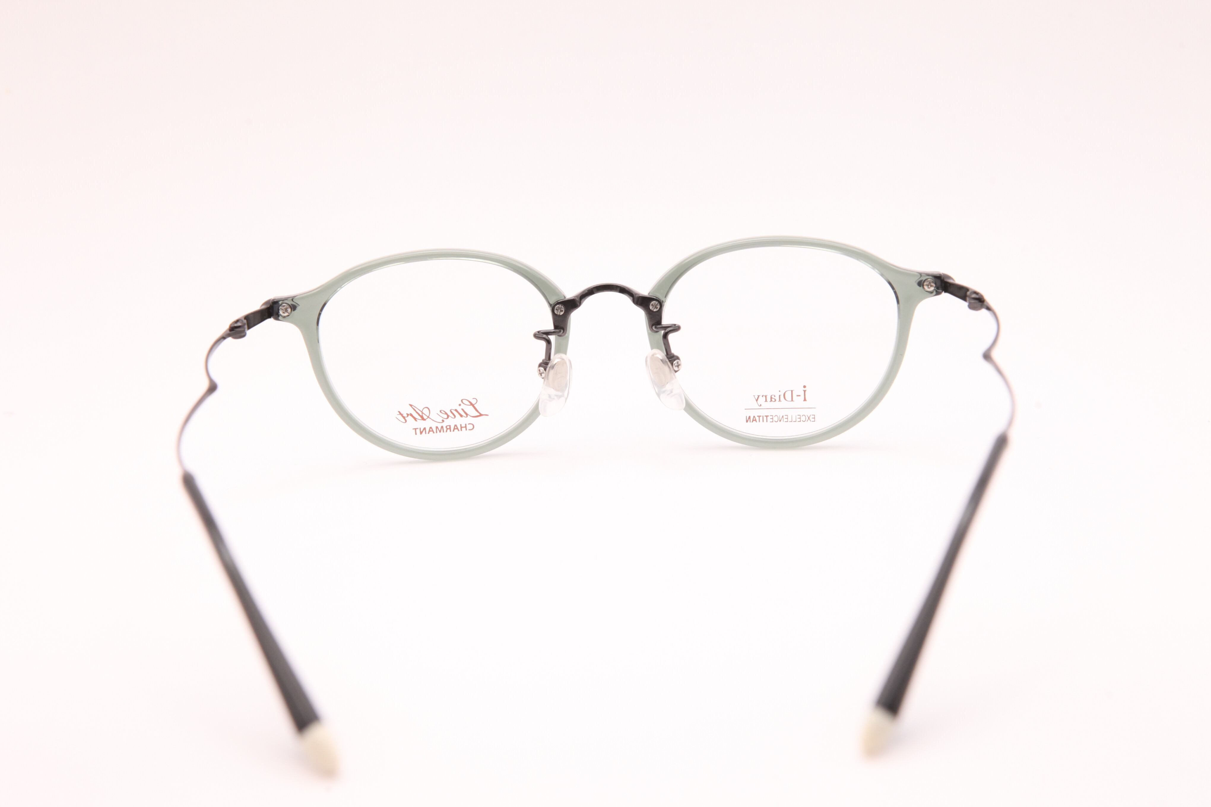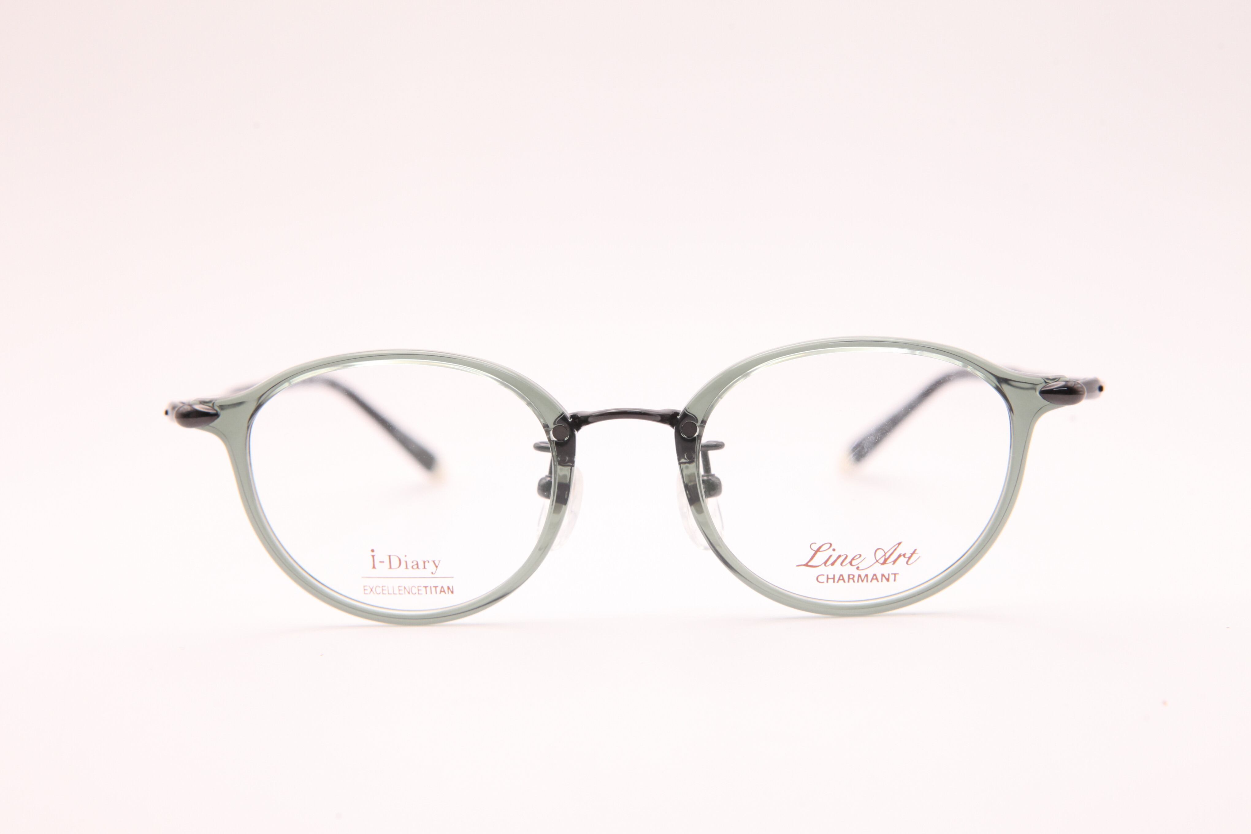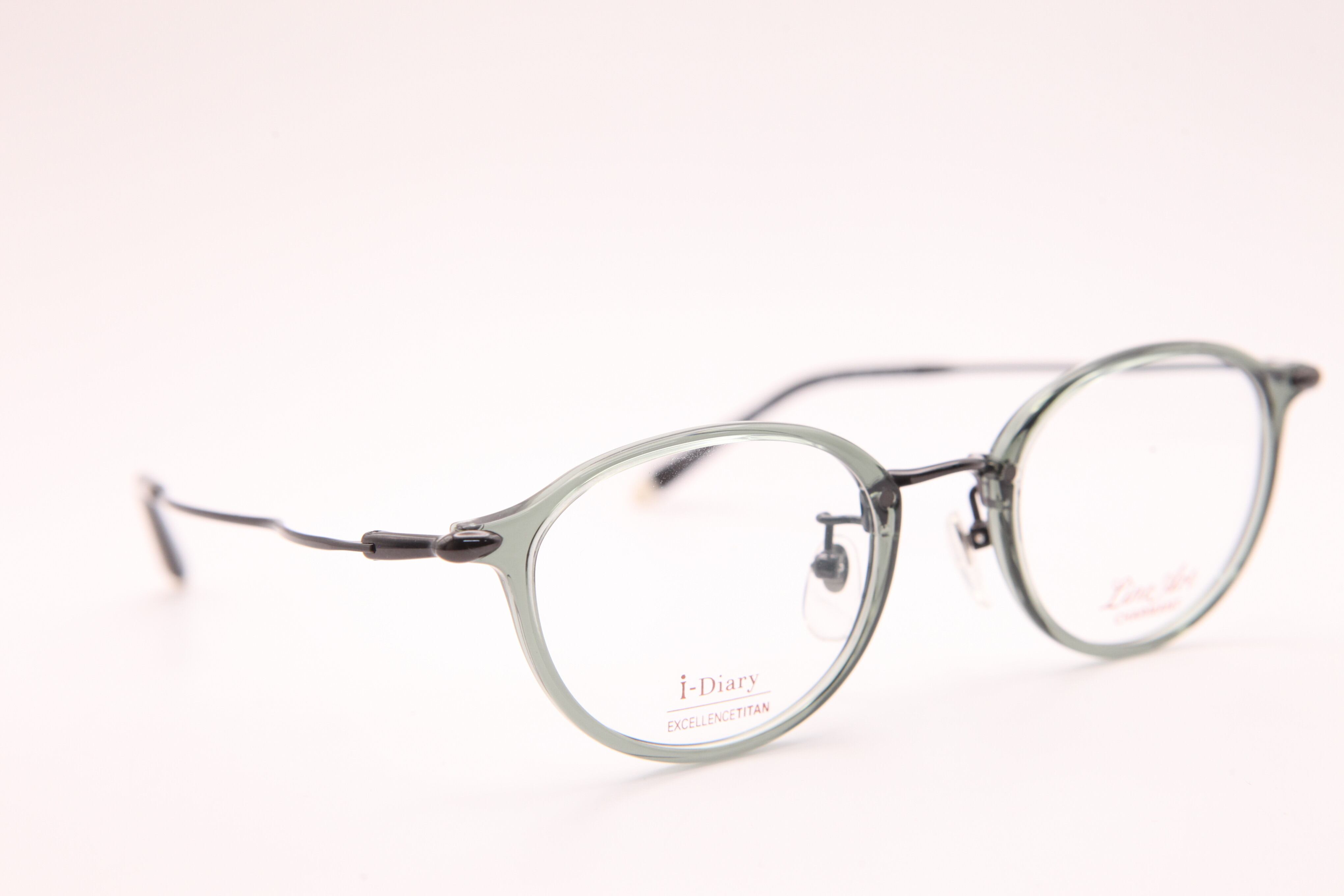 カラーはニュアンス感のあるグリーン。お顔になじみやすいグリーンで、度数が強い方でも目が小さく見えにくいです。小さめのレンズサイズでも頭部は幅広設計なので掛け心地の良さはそのまま。ペアシェイプの飾りがポイントです。