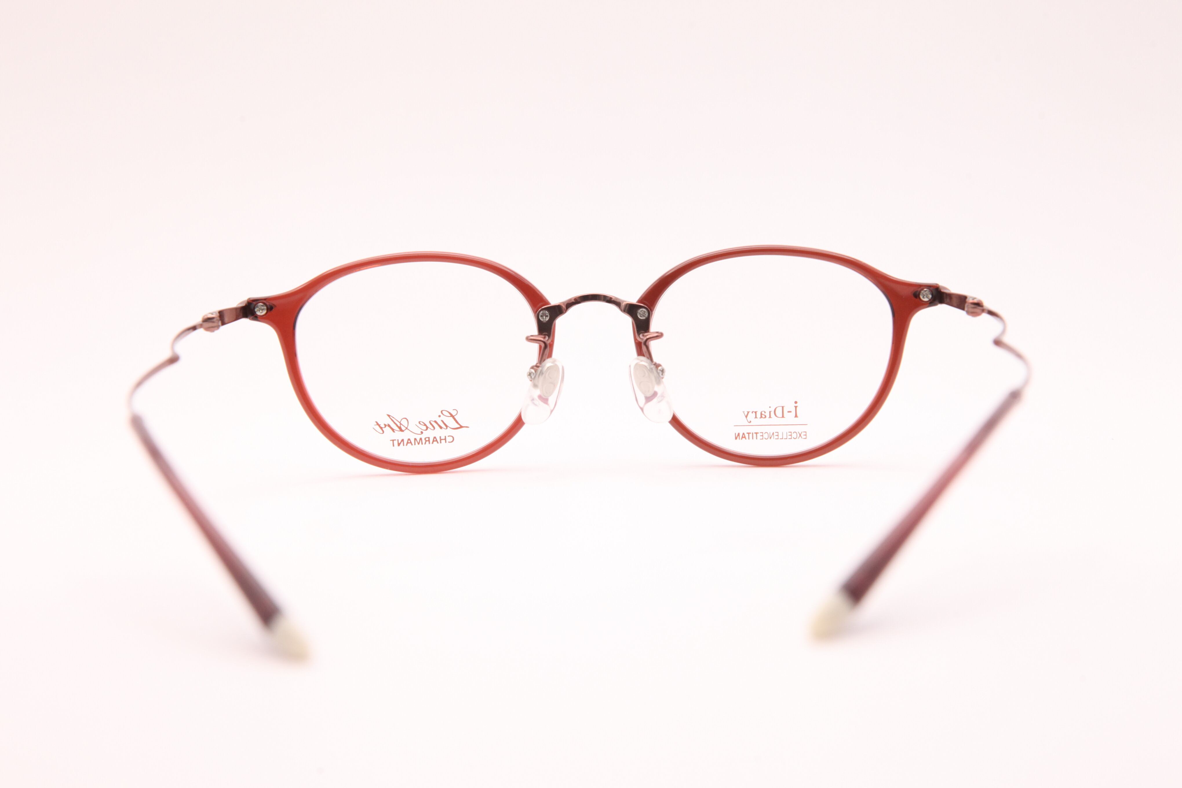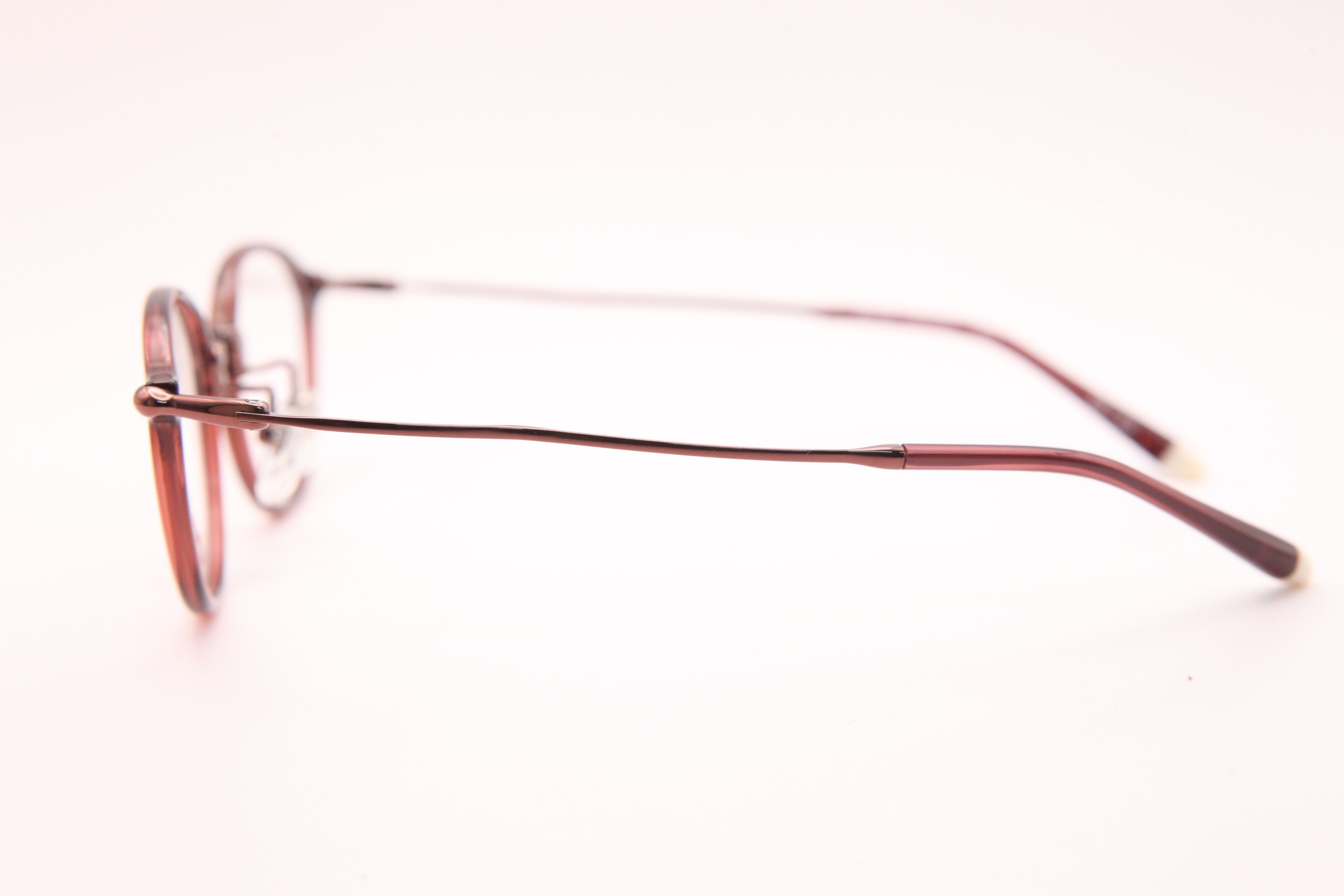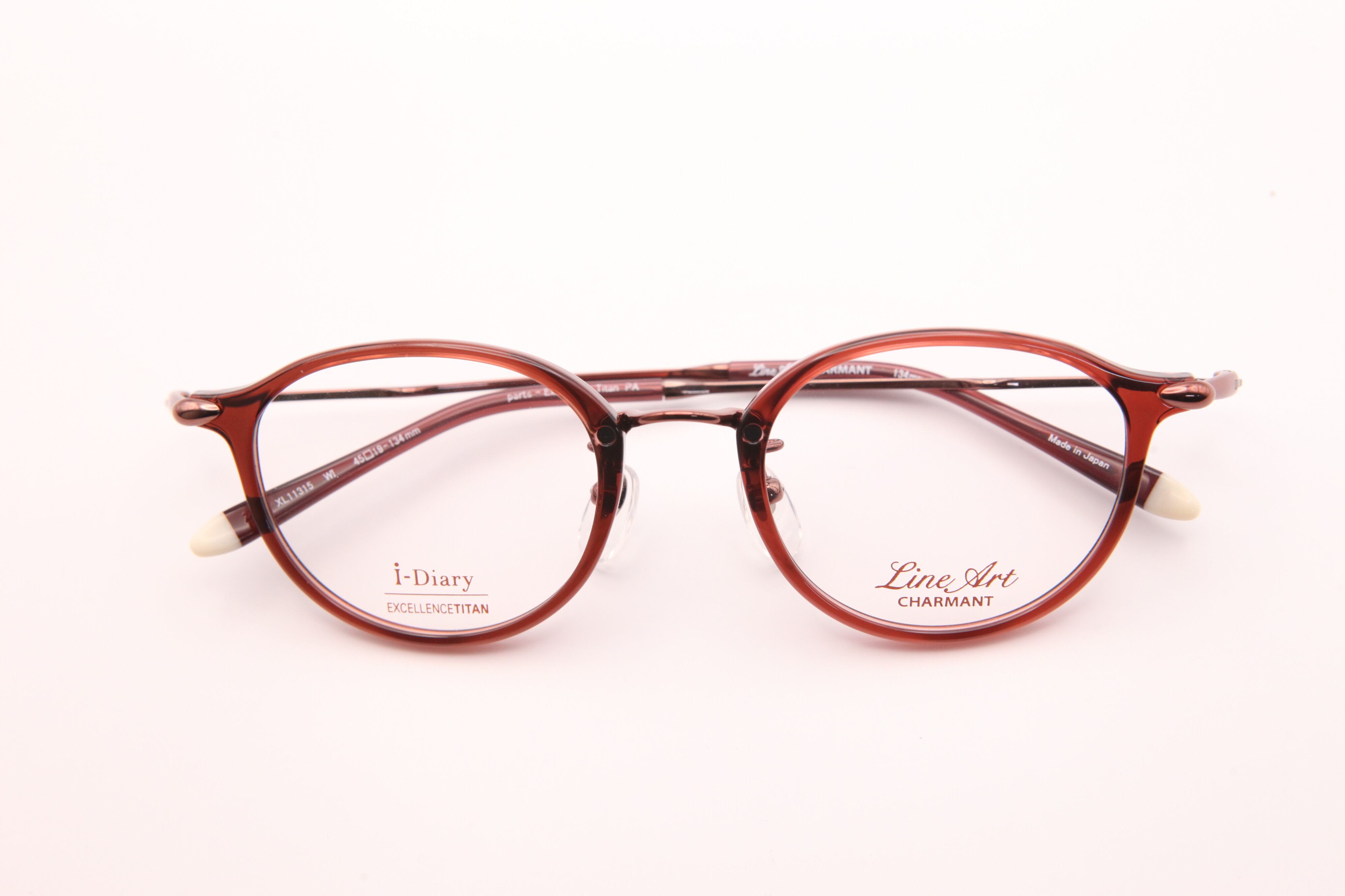 カラーはワイン。女性らしいワインカラーは、お顔を華やかに見せます。度数が強い方でも目が小さく見えにくいのも嬉しい。小さめのレンズサイズでも頭部は幅広設計なので掛け心地の良さはそのまま。ペアシェイプの飾りがポイントです。